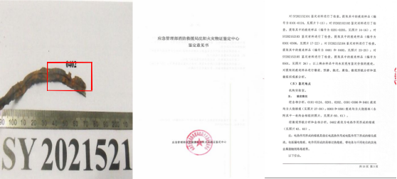 (1)起火點處提取到的燈具線路蛇皮金屬管有燒蝕、擊穿痕跡,并與電氣線路金屬線芯殘骸黏連,經應急管理部消防救援局沈陽火災物證鑒定中心鑒定,此處痕跡為電熱作用形成的金屬熔痕。