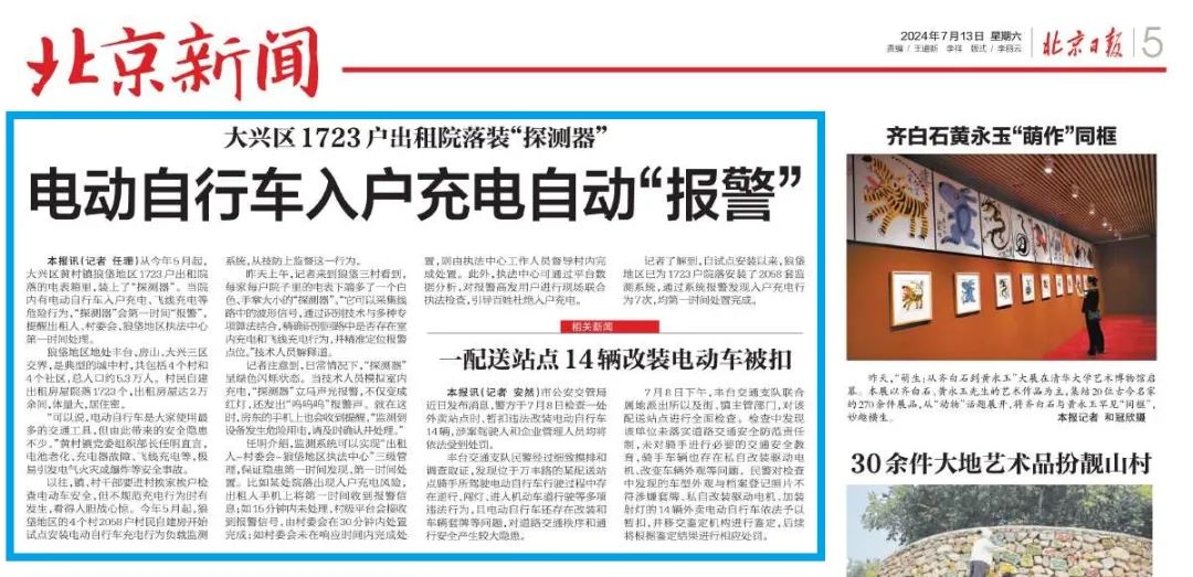 7 月 12 日上午,北京日報記者來到狼垡三村看到,每家每戶院子里的電表下端多了一個白色、手掌大小的 DT-240。“ 它可以采集線路中的波形信號,通過識別技術與多種專項算法結合,精確識別回路中是否存在室內充電和飛線充電行為,并精準定位報警點位。” 航天常興技術人員解釋道。