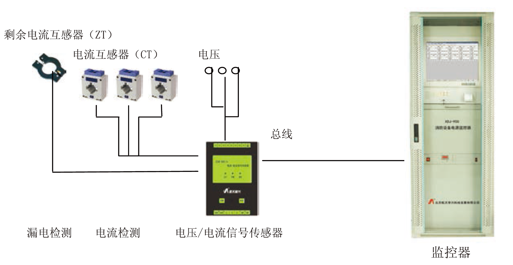 消防設備電源電壓/電流信號傳感器安裝于配電盤或配電柜內,監控器安裝于值班室。