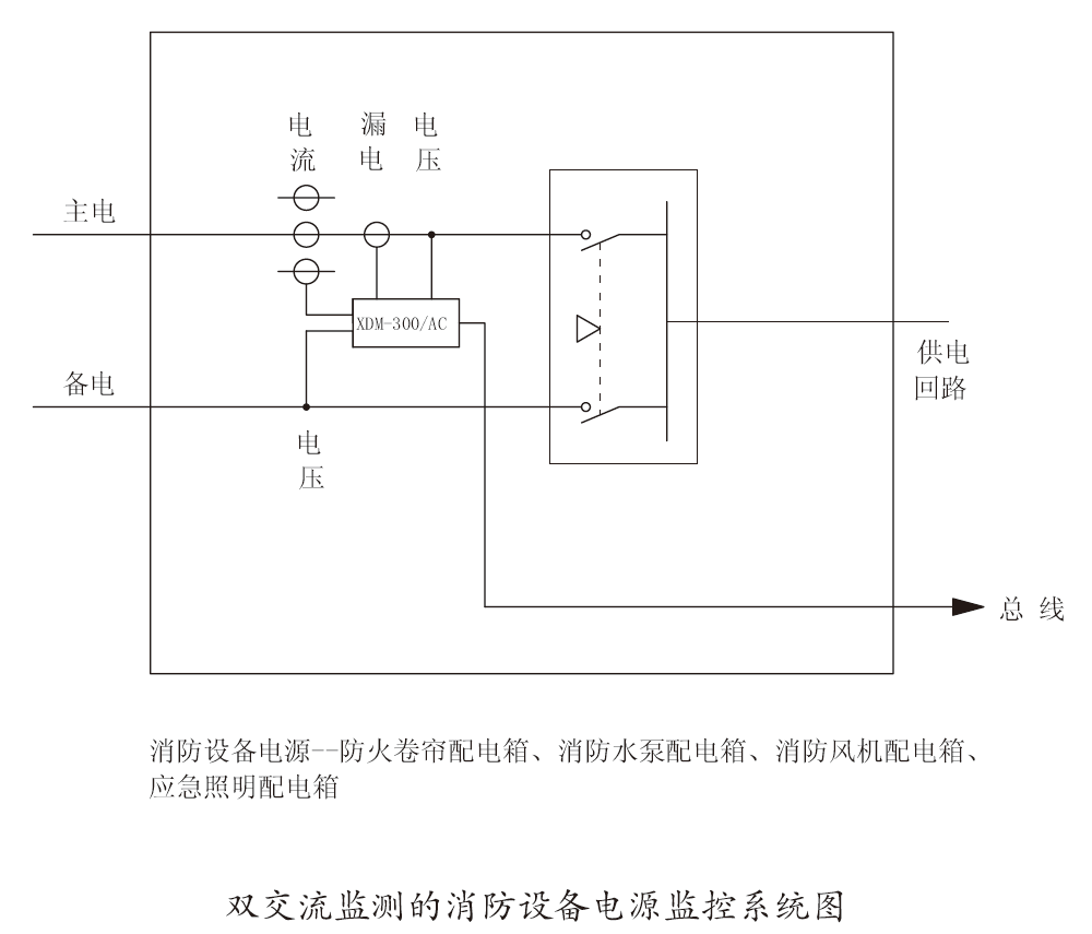消防設備電源監控系統用于一般工業與民用建筑中AC220V/380V配電線路中安裝的消防設備電源的在線監控,當消防設備電源發生過壓、欠壓、過流、漏電、缺相等故障時監控系統能立即發出報警信號,可及早發現問題從而避免各種事故的發生。